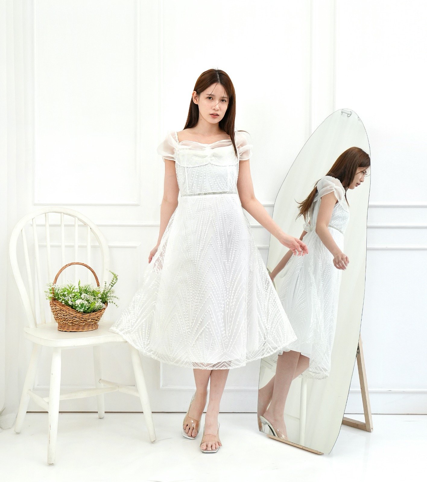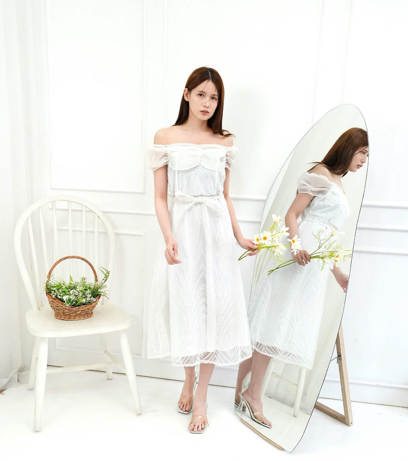 Dress Midi Mekar Tulle Lengan Sabrina Organza Khusus Putih