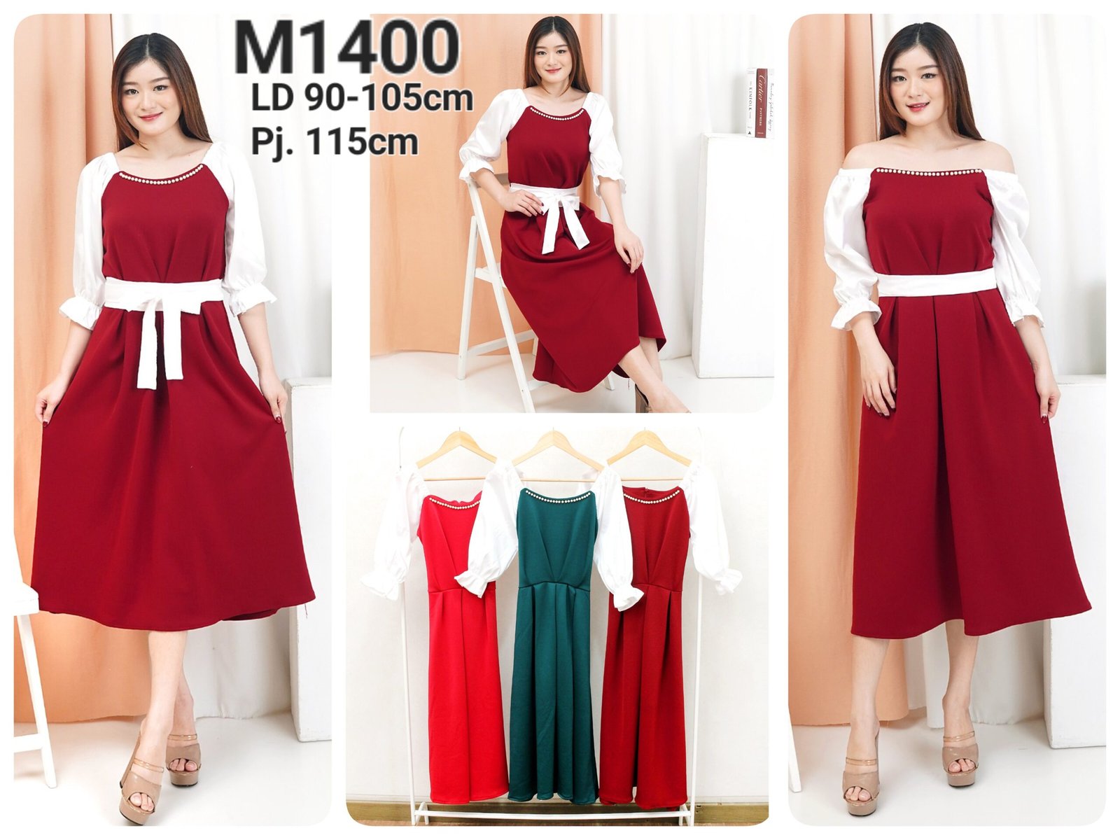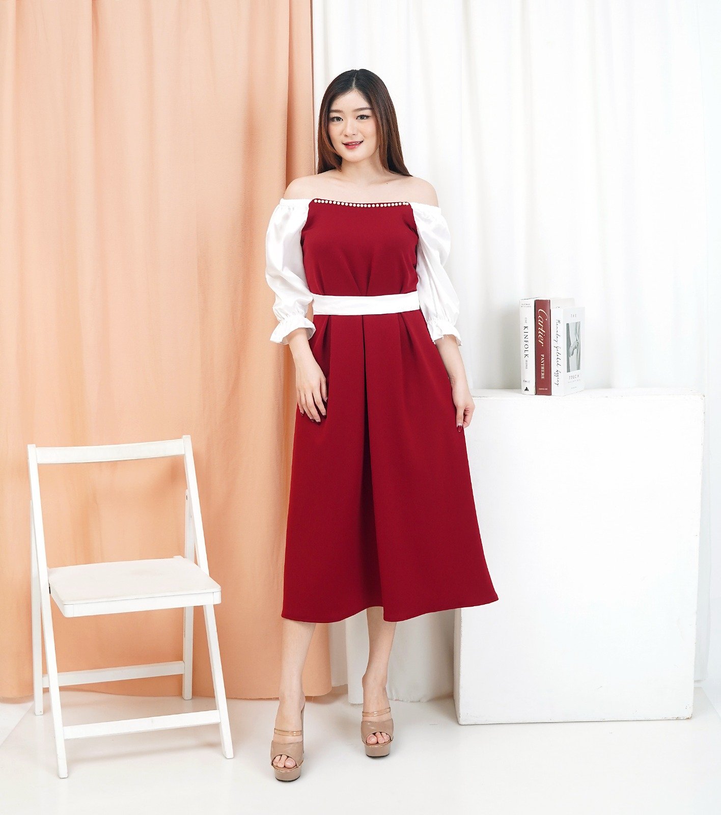 Dress Midi Rok Mekar Mutiara Scuba Kombinasi Lengan & Tali Satin