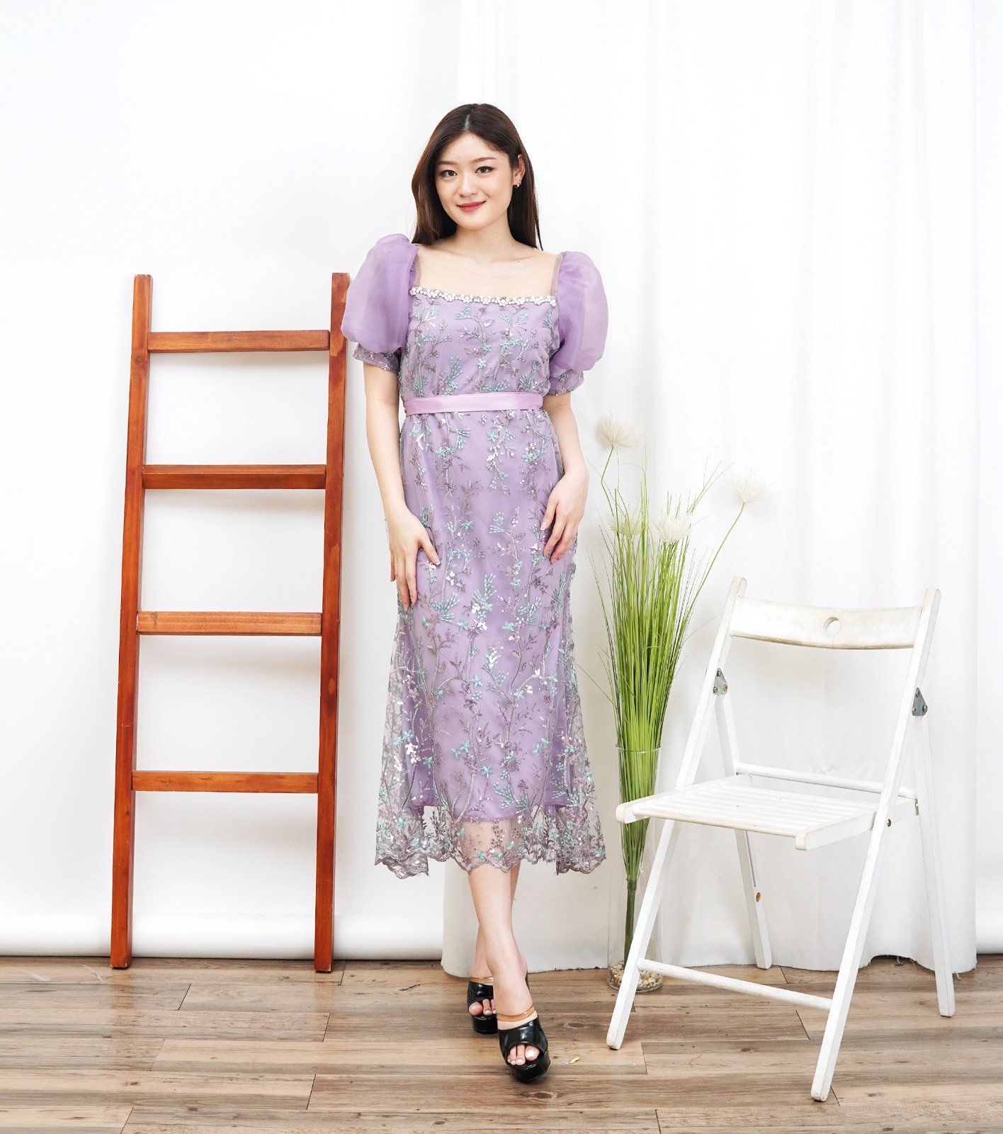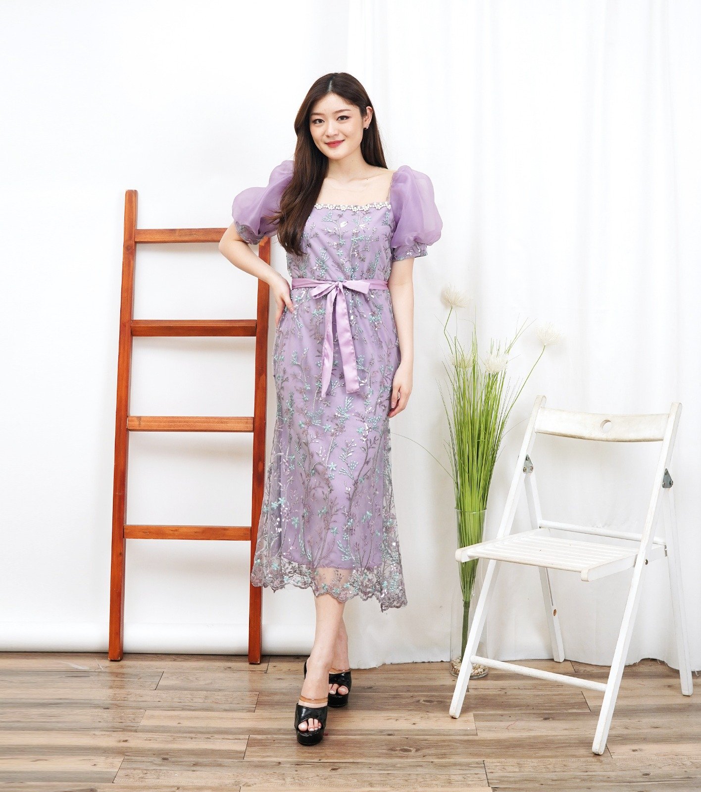 Terdapat variasi mutek pada bagian dada dress.