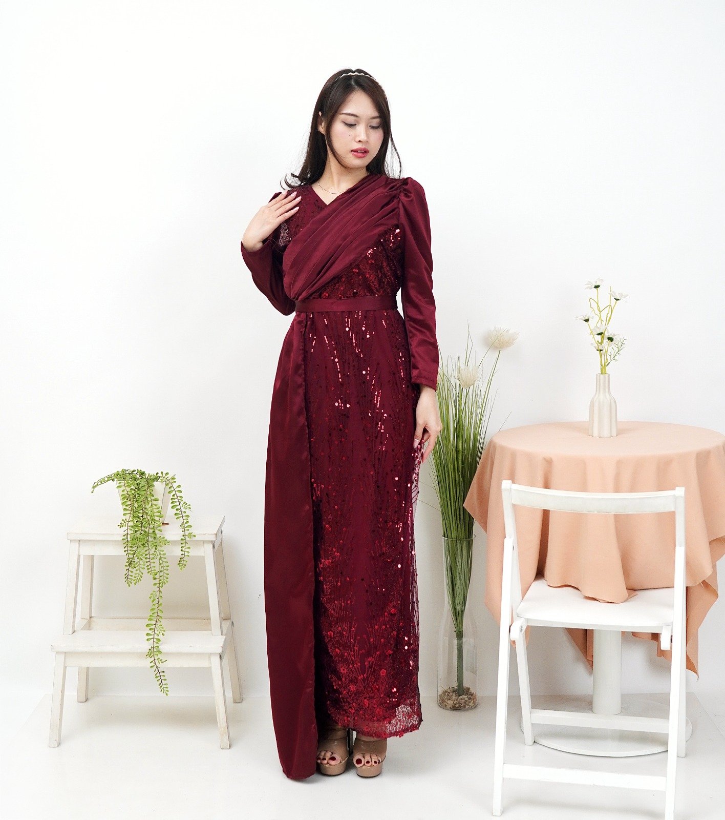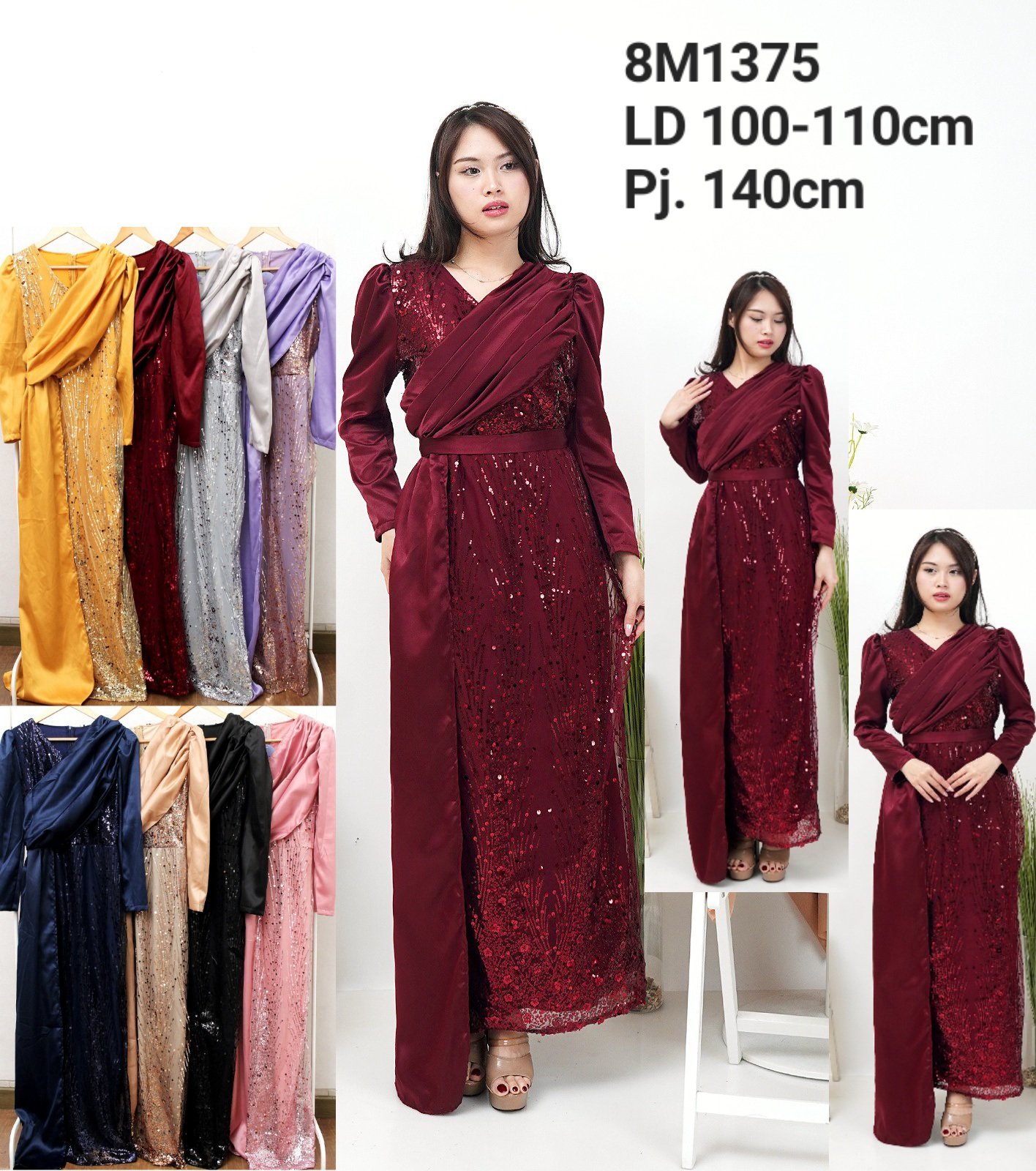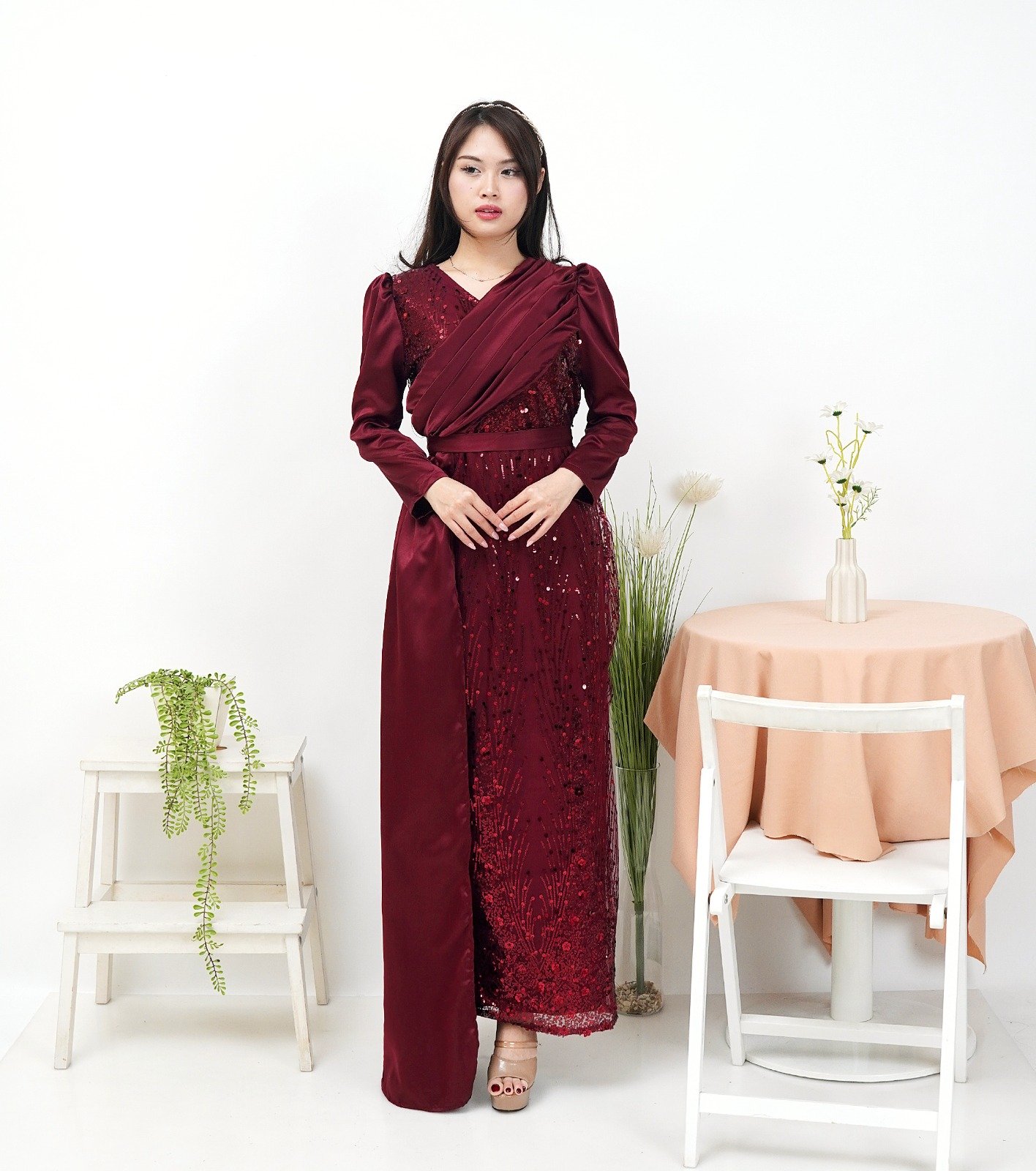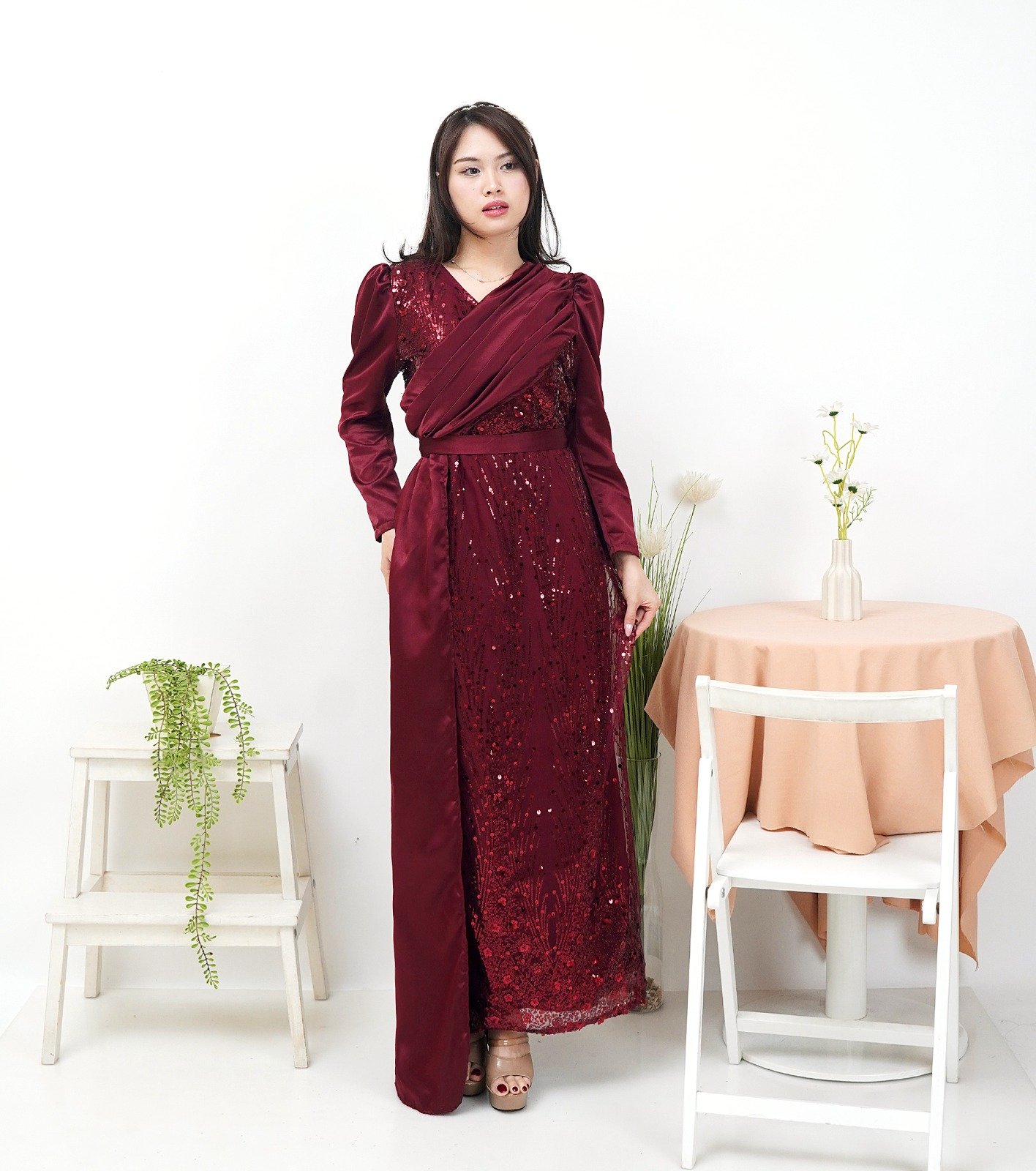 Long Dress Tulle Tangan Panjang Kombinasi Satin Gaya India