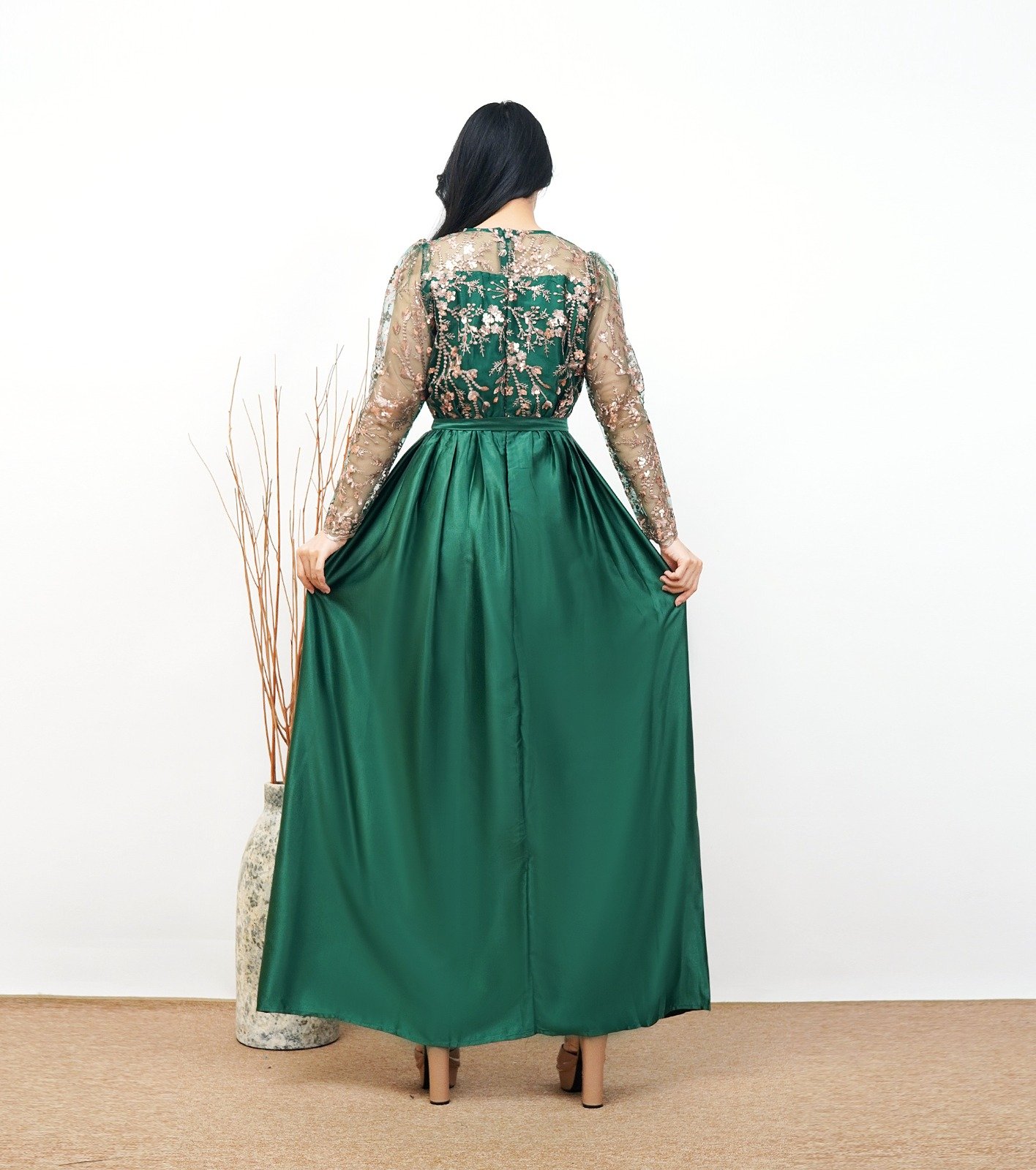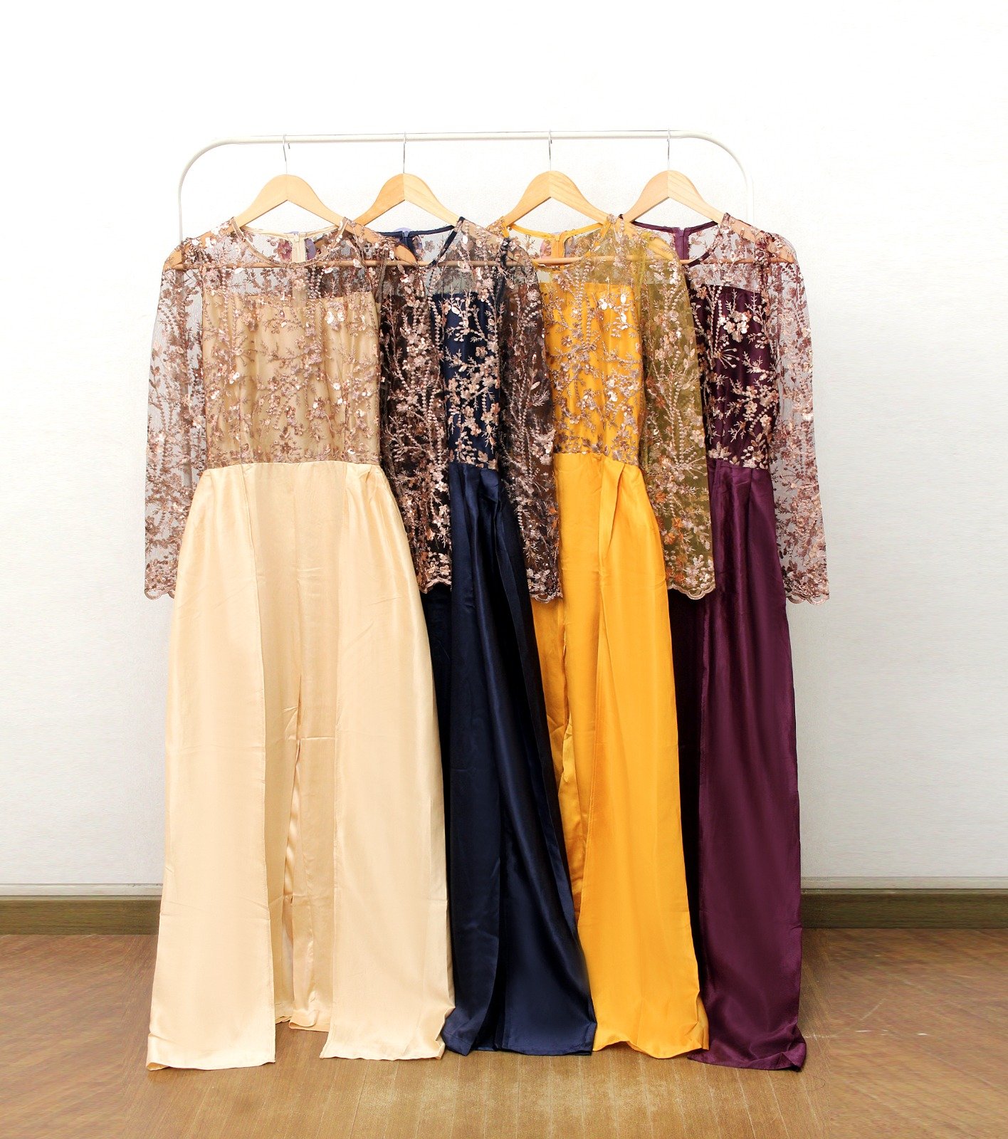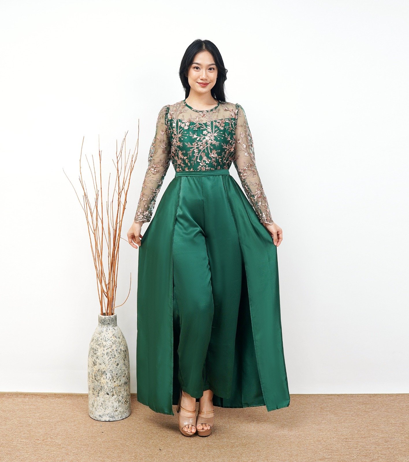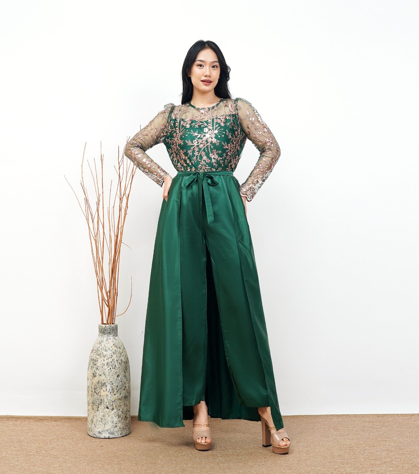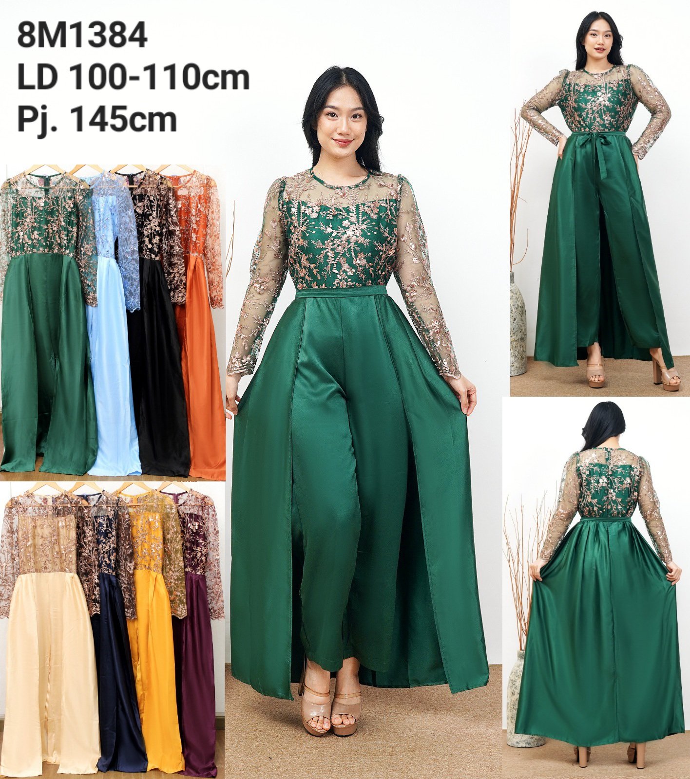 Jumpsuit Lengan Panjang Tulle & Celana Panjang Satin.