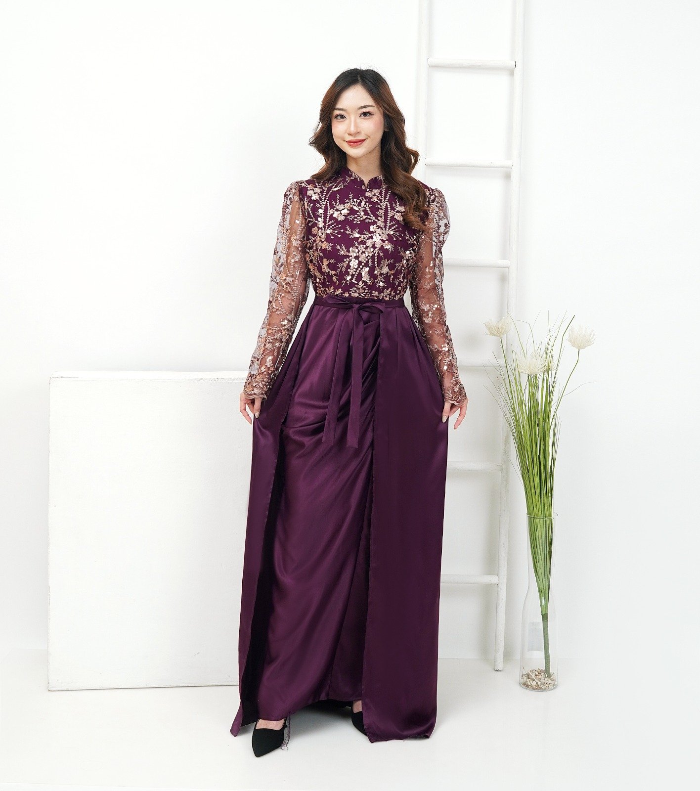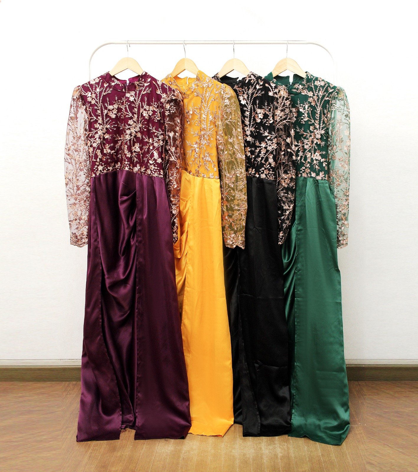 Long Dress Tulle Tangan Panjang Kombinasi Bawahan Satin 2 layer.
